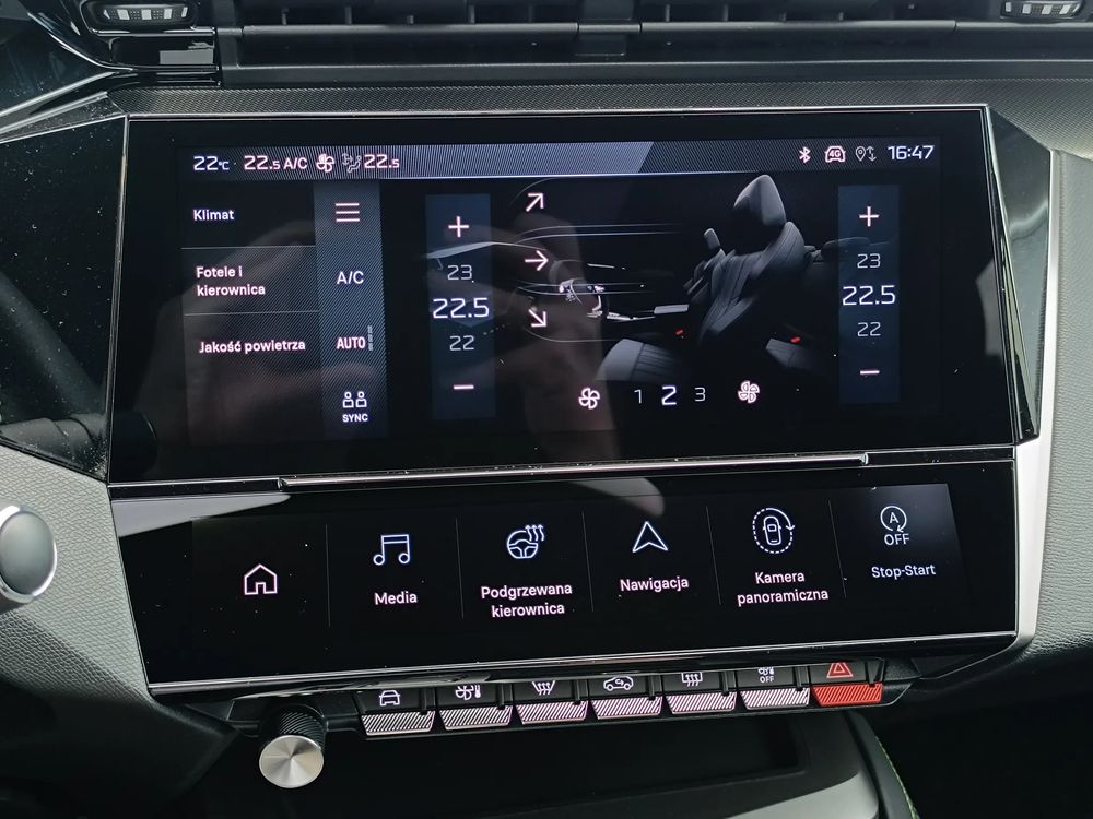 - Pakiet Bezpieczeństwo: Peugeot i-Cockpit 3D Quartz, 10" panel konfigurowalnych zegarów cyfrowych (GMAW), Alarm obwodowy, wolumetryczny, z akcelerometrem i czujnikiem przechyłu, Pakiet Drive Assist Plus,, Czujniki parkowania z przodu i z tyłu, VisioPark 360 (4 kamery, widok 360°)