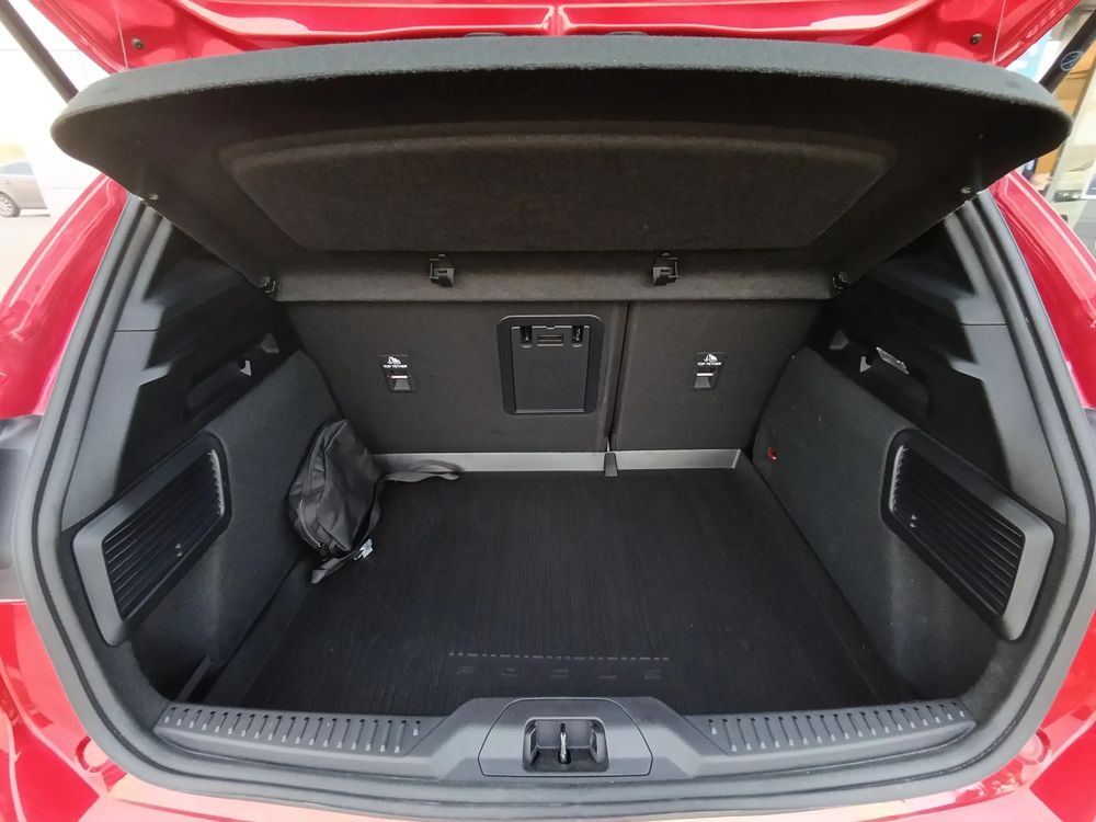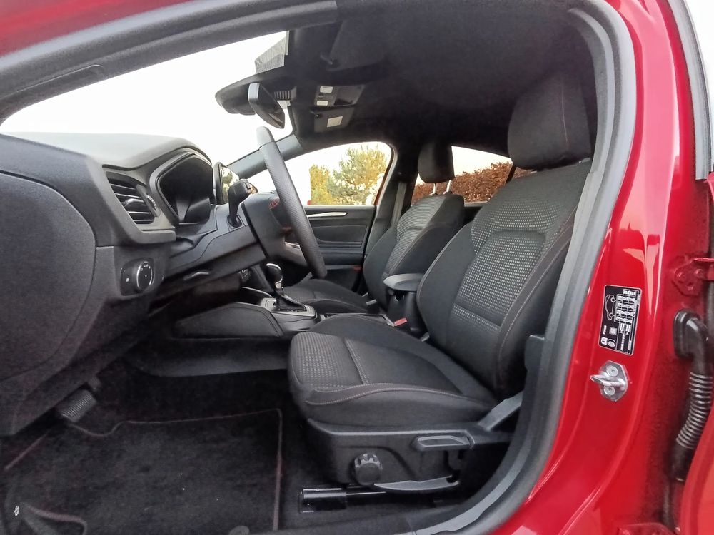 • Tapicerka materiałowa ciemna z czerwonymi przeszyciami