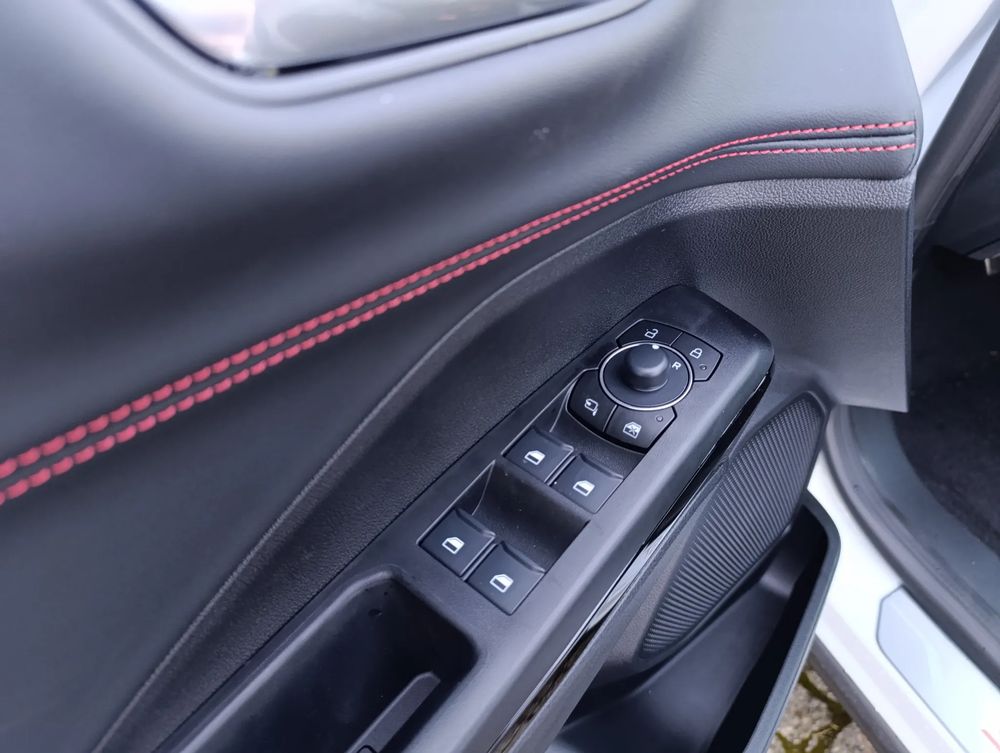 • Przednie fotele w stylu sportowym z tapicerką z elementami skóry ekologicznej w ciemnej tonacji i przeszyciami w kolorze czerwonym; fotel kierowcy i pasażera regulowany w 4.kierunkach