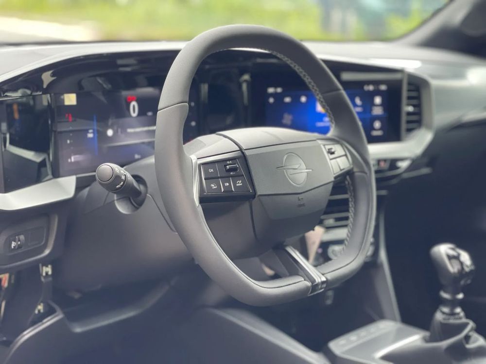 Sportowe koło kierownicy pokryte skórą ekologiczną, spłaszczone u dołu, z przyciskami sterowania