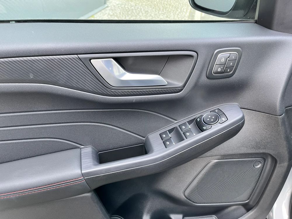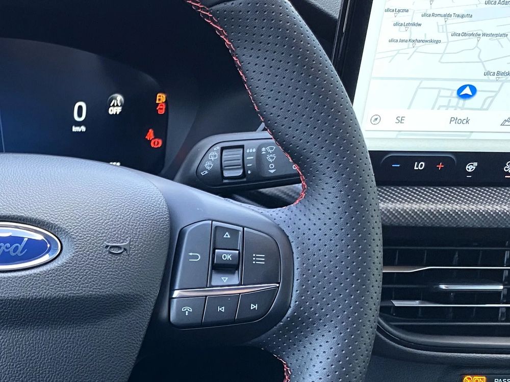 - Tapicerka częściowo skórzana w stylizacji ST-Line z czerwonymi przeszyciami